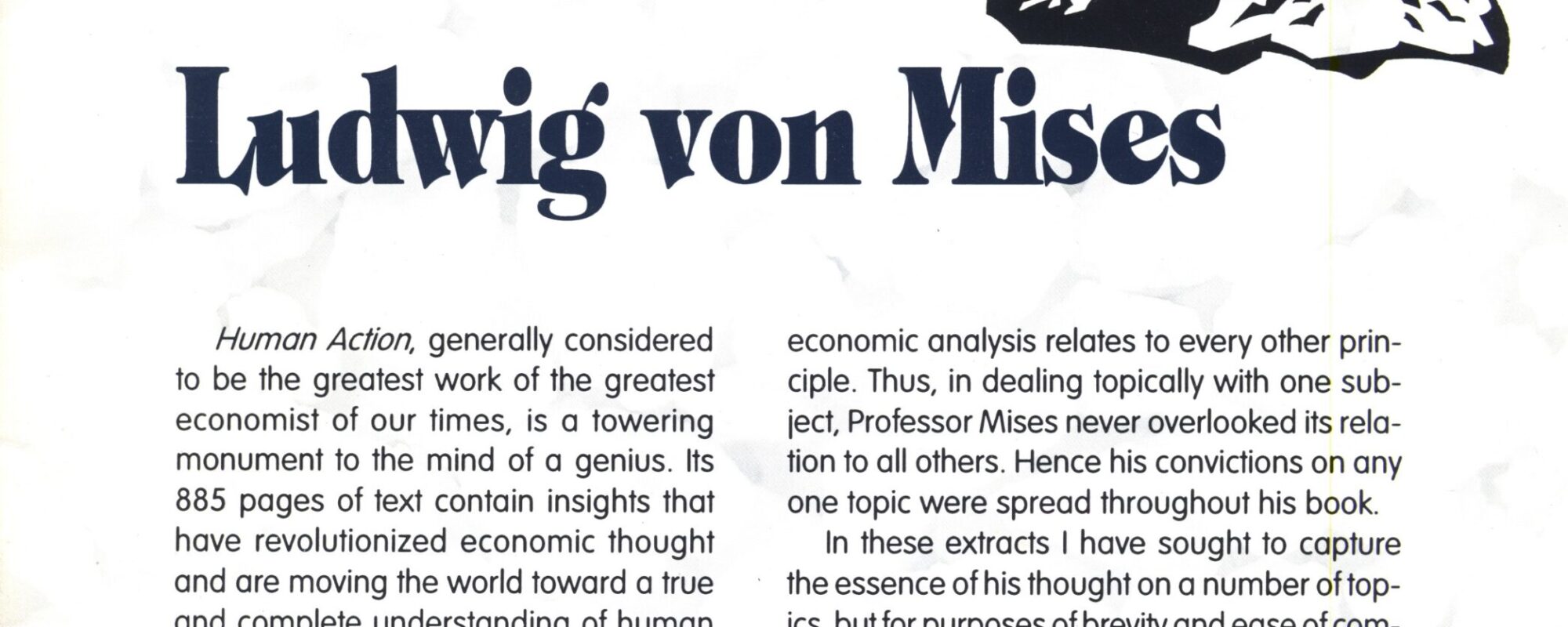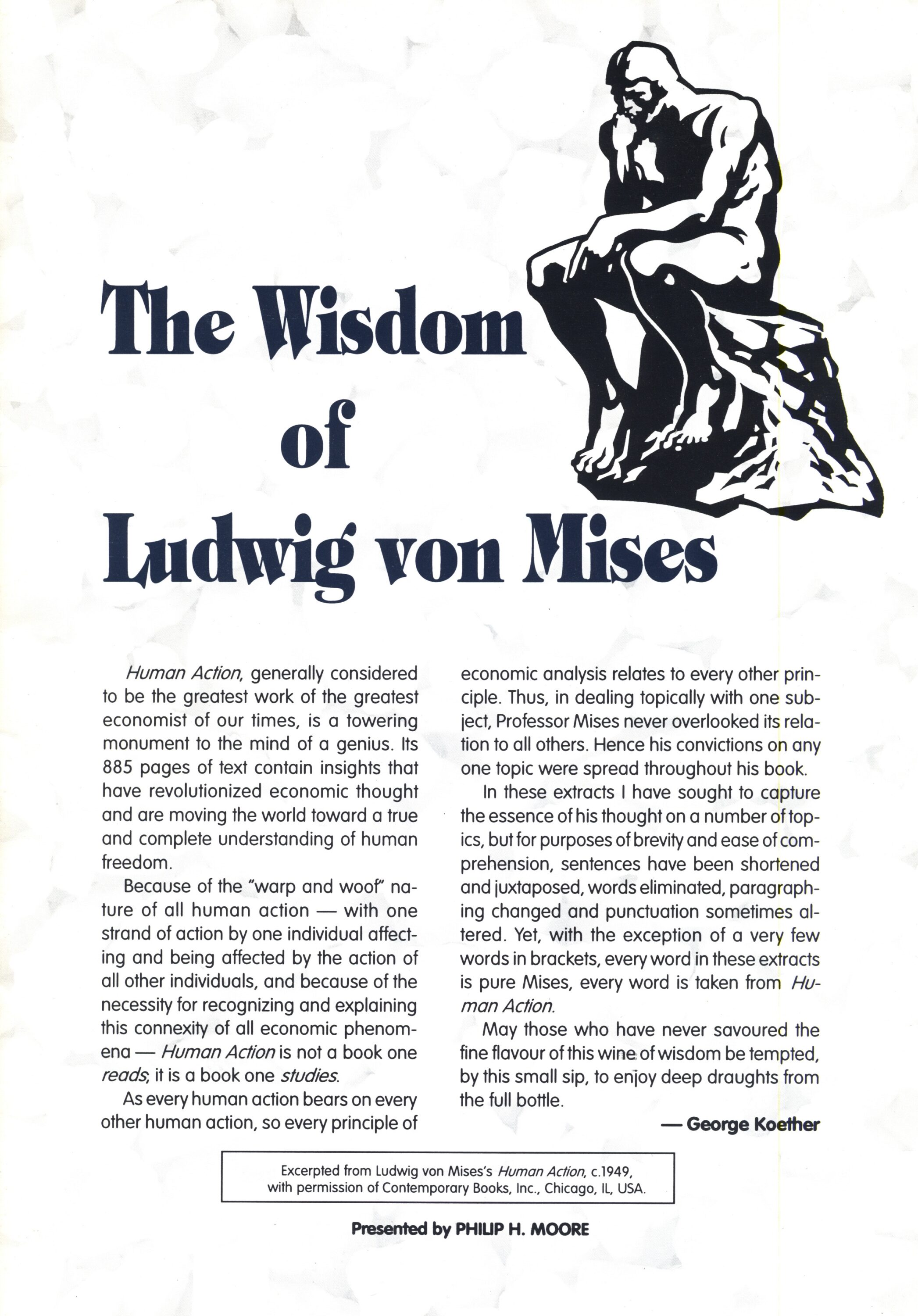 ~ the essence of his thought on a number of topics, but for purposes of brevity and ease of comprehension, sentences have been shortened and juxtaposed, words eliminated, paragraphing changed and punctuation sometimes altered. Yet, with the exception of a very few words in brackets, every word in these extracts is pure Mises, every word is taken from A Human Action.